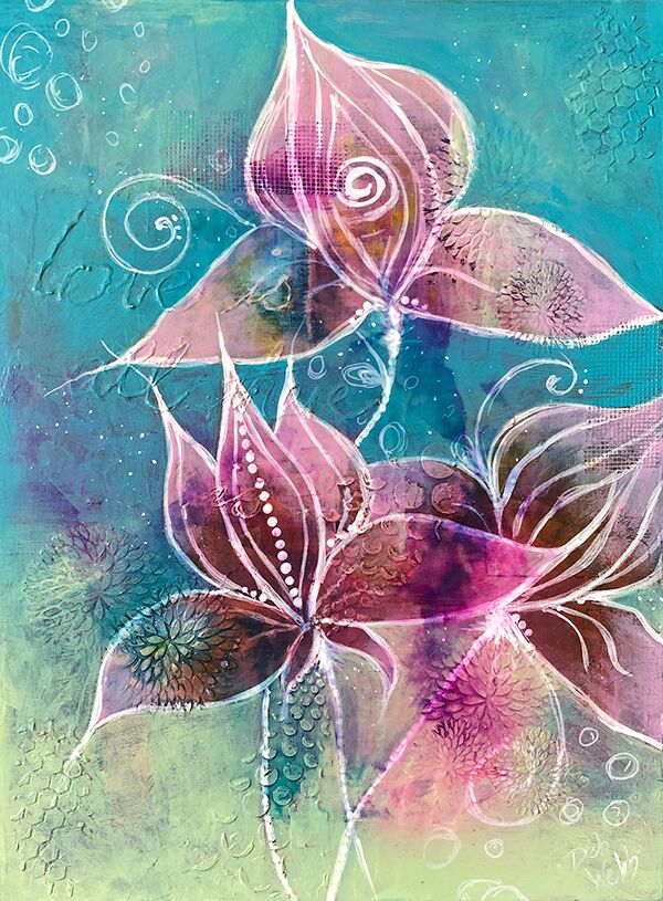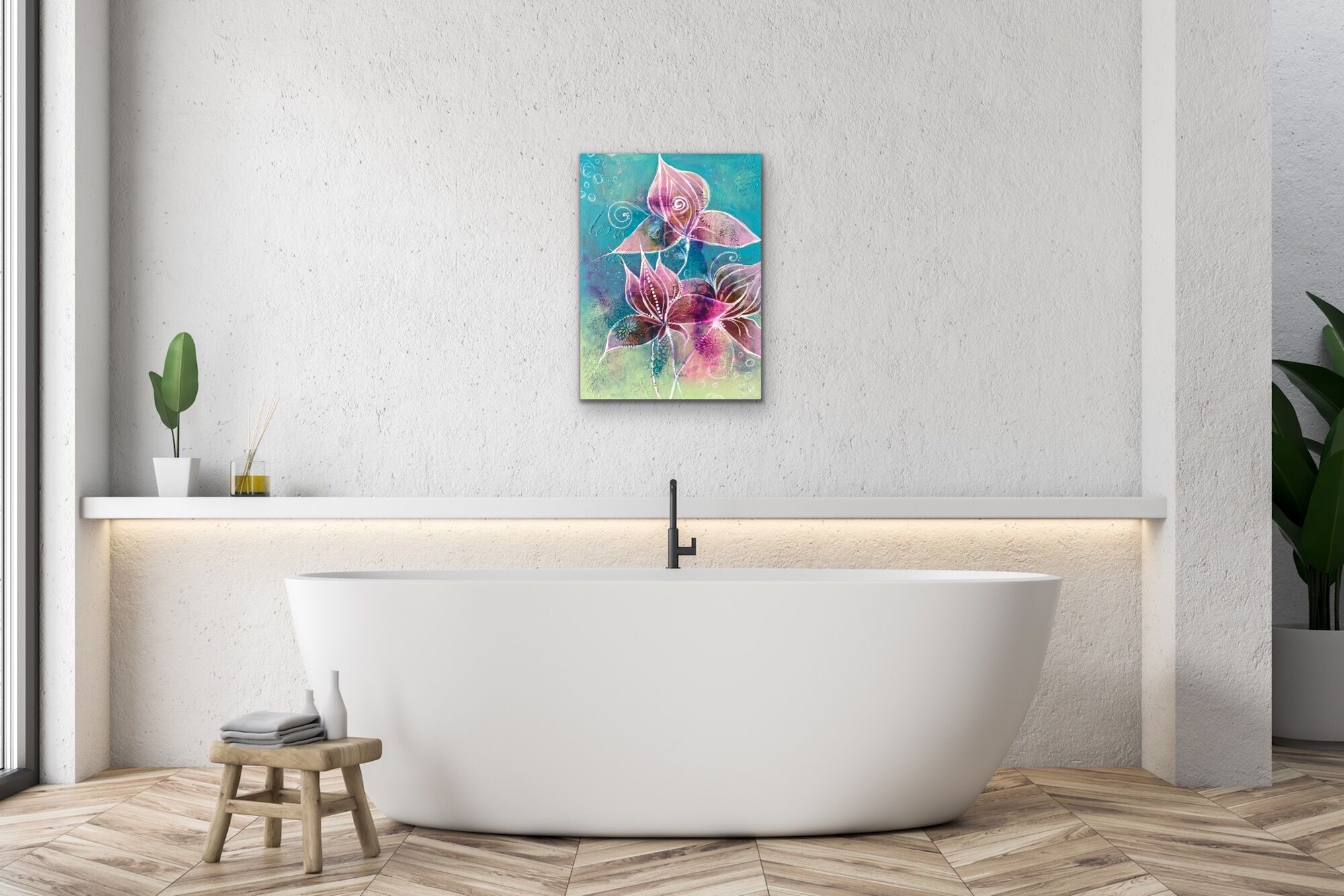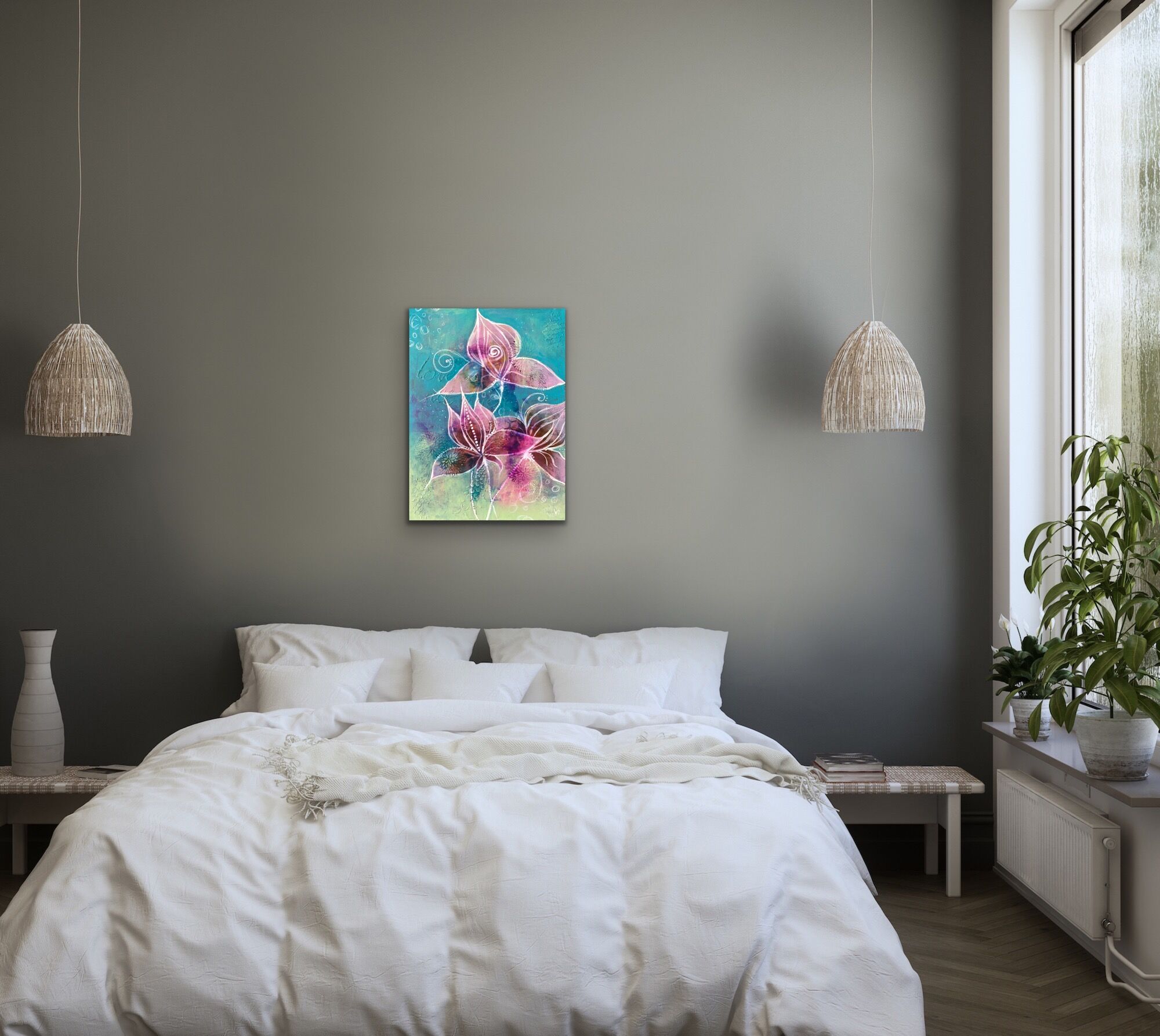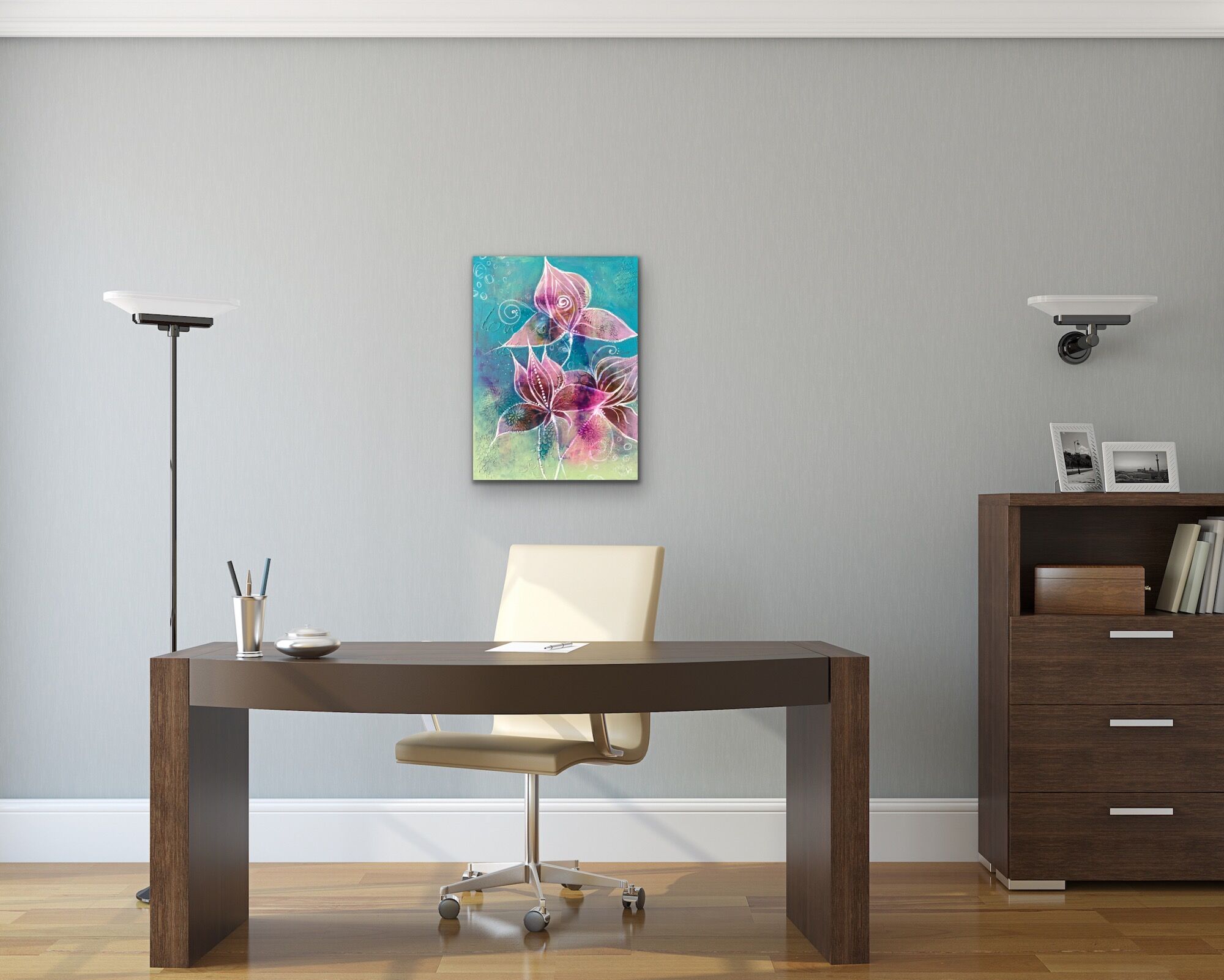 Flowers in Bloom is an original artwork on a medium sized gallery wrapped deep canvas in portrait orientation.