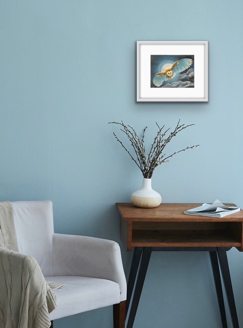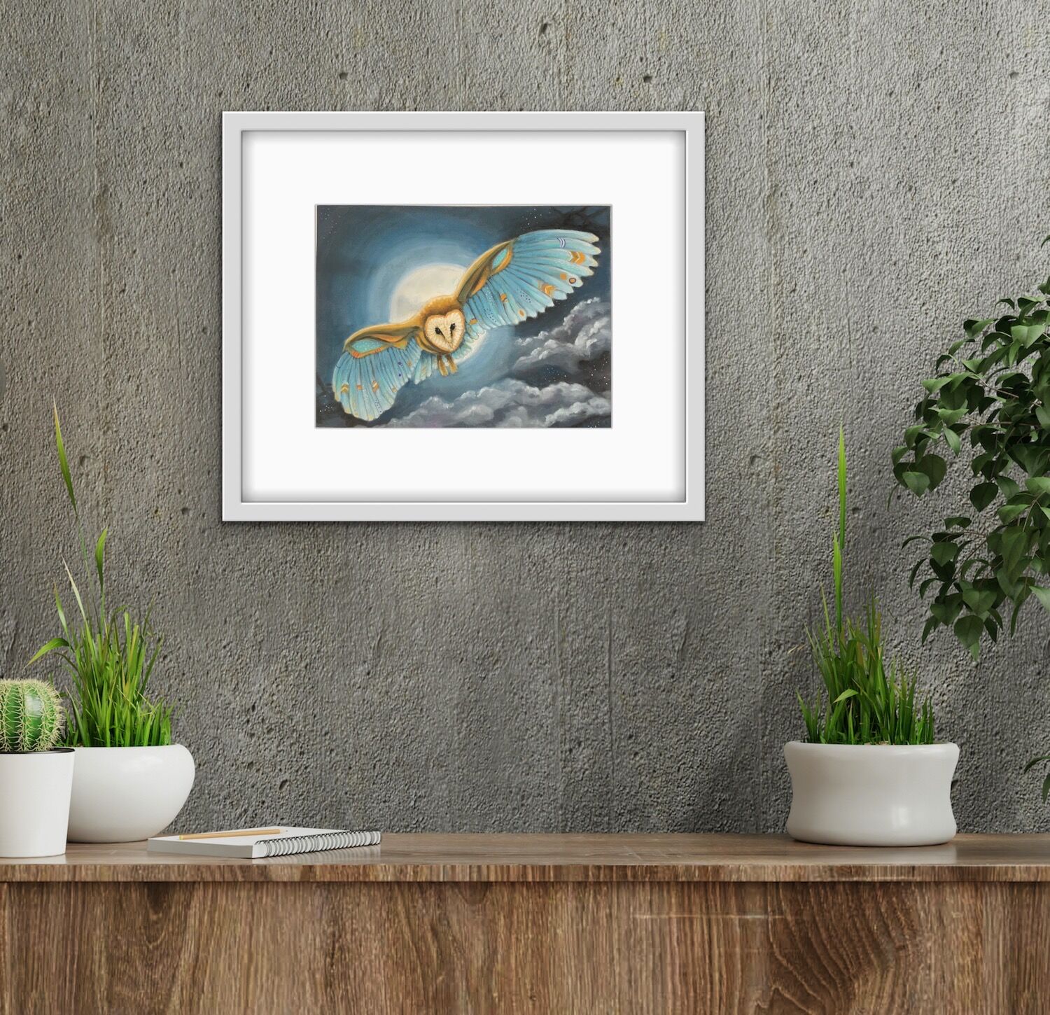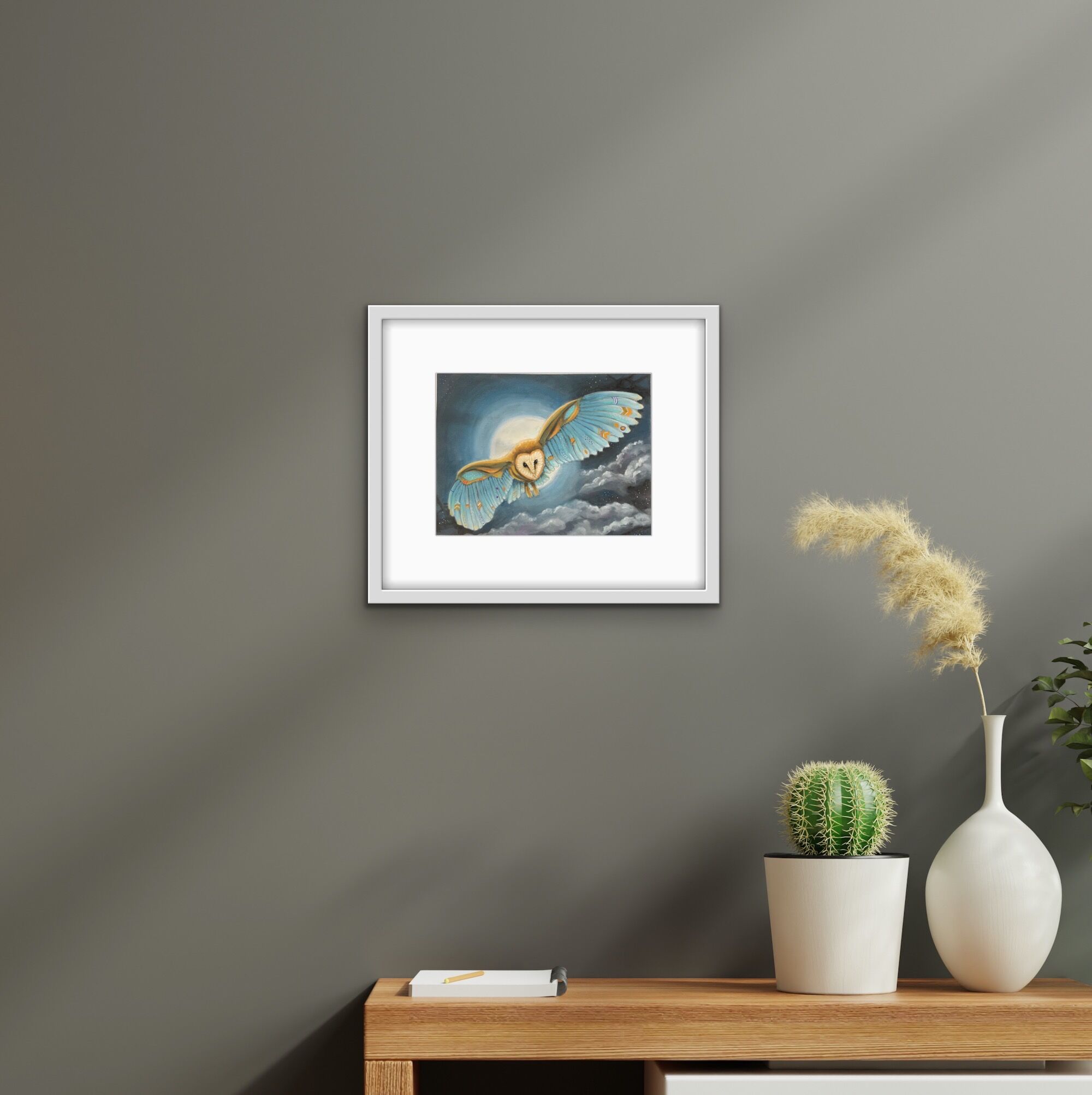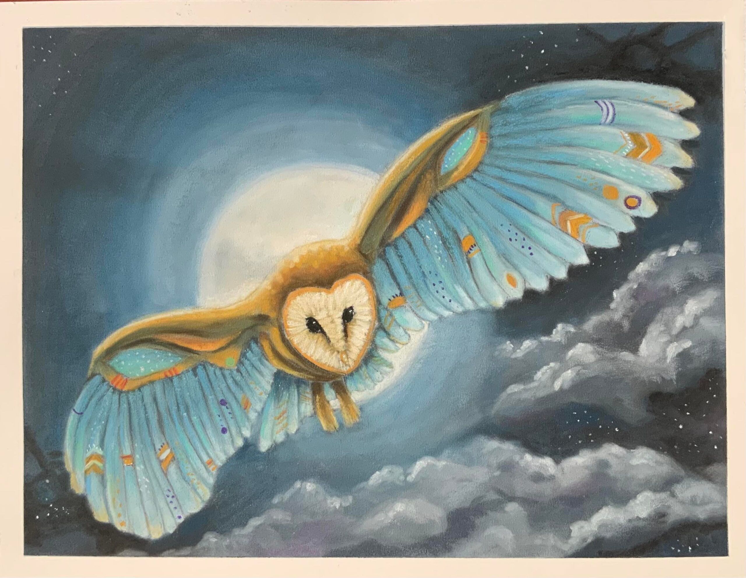 The “Night flight of the Blue Owl” artwork is an giclee print taken from an original created using pan pastels.